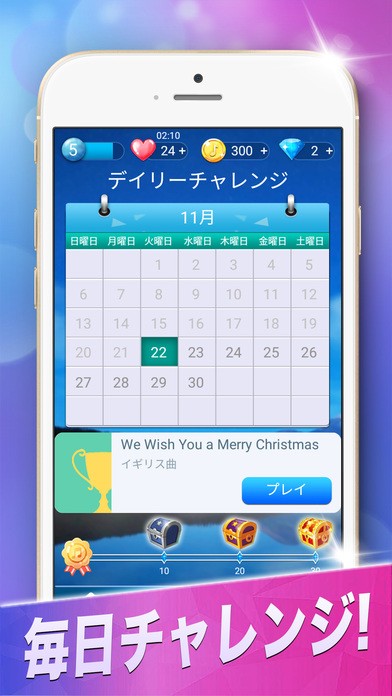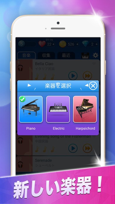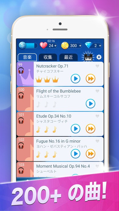 無事に一曲演奏し終えると経験値が入り、コインがもらえます。経験値が一定以上たまると、新しい曲が開放されます(曲は、コインまたはダイヤでも開放可能)。