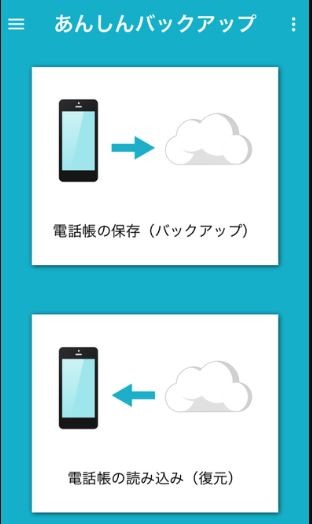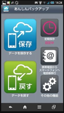 【あんしんバックアップ】のアプリを起動すると、画面定にデータを保存する、データを戻すなどの操作のアイコンが出てきます。そのアイコンを操作することで、データの保存や戻す操作が行えます。