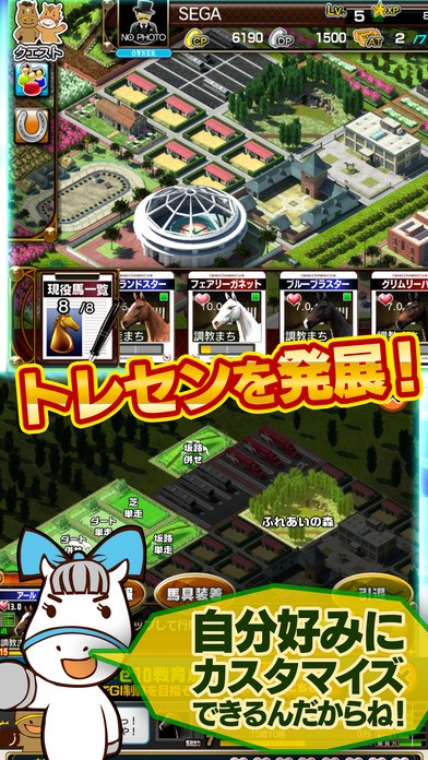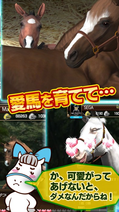 ゲーム画面はメニューが多彩で難しいそうに見えますが、ゲームの主な流れはシンプルで、プレーヤーの所有馬の調教、エサやり、レース出走を繰り返しながら、その合間に生産牧場で競走馬の生産をしていくという流れになります。VSレースなどのイベントも開催されるので、積極的に参加してポイントをゲットしたいところです。「縦エサ」とは、にぼし、馬おクッキーなどのエサのことで6種または5種のアビリティーが上がるエサのこと。「5本盛り」とは、アビリティの5項目をほぼMAXにすることです。アビリティの総量は決まっており5.3本が最大となります。「御当地エサ」を使うと大きな効果が得られます。生産馬の毛色は栗毛、鹿毛、芦毛といった実際の競走馬でもいるものに加えて、牛、豹、ダルメシアン等、ユニークな毛色の馬もいてプレイヤーをビジュアル的も楽しませてくれます。