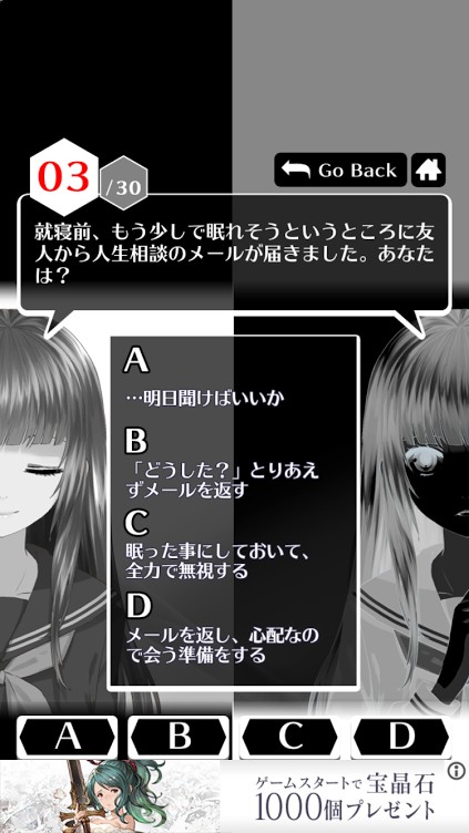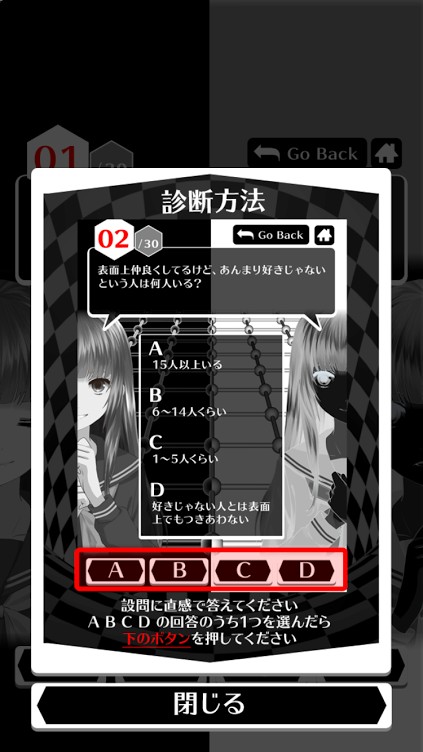 「無料診断心理テスト 表裏性格診断」の操作の仕方ですが、操作方法はいたってシンプルです。心理テストは全30問あるので一つ一つ解答していきます。質問文の所には30問に対して今何門目なのかが一目で分かるようになっています。解答は選択式でA,B,C,Dの4択です。。中には自分の思う解答がない場合もあるでその時は4択の解答の中であなたならどの解答を選ぶかで解答すると良いですよ。間違って解答してしまっても前の問題に戻れば解答を選び直すことができるバック機能付きなので安心してプレイできます。
