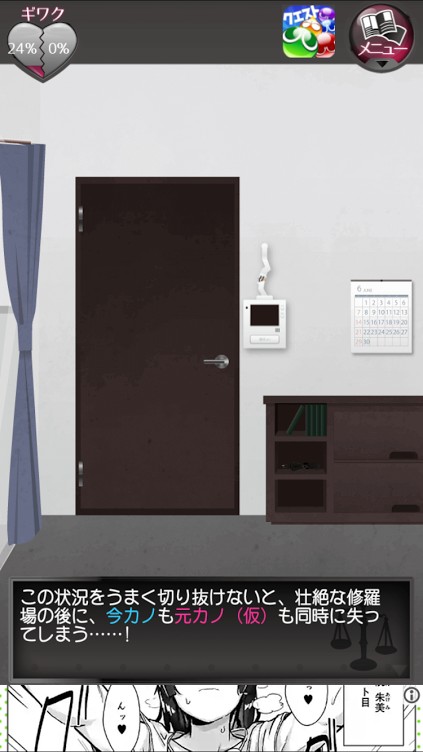 このアプリは「僕には今、彼女が二人いる。でも、二股なんかじゃない。」というセリフからいきなり物語が始まります。主人公には今付き合っている女性が2人いて、この2人にお互いの存在がバレないように脱出することができるのか。アプリ内ではなんとかしてお互いの存在をバレないようにいくつかのミッションが盛り込まれています。初めのミッションでは「インターホンを止めろ」と提示されるので何か手段を探してインターホーンを止めなければなりません。失敗するともう一度同じミッションに挑戦してバレないように主人公が試行錯誤して切り抜けていきます。時には彼女たちとメッセージを交わしたりなどリアルな体幹を味わうこともできるのが魅力です。また、「ギワク度」というものがあり、元カノ(仮)と今カノそれぞれの主人公に対する疑いの気落ちを表す数値でやがて迎える結末に大きく関わってきます。