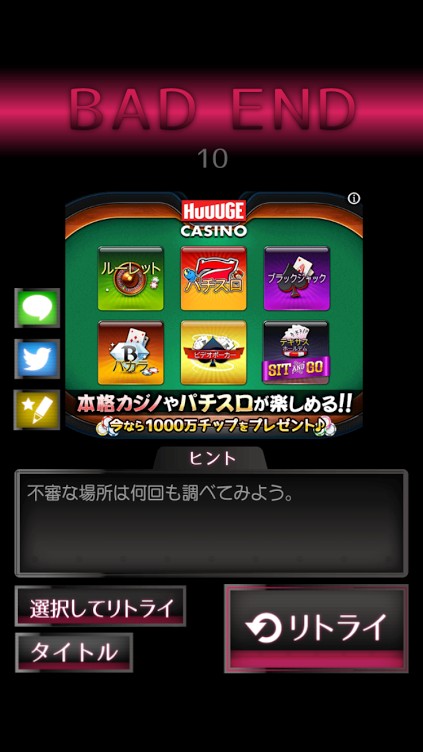アプリ内の操作のやり方ですが、このアプリは問われた質問に対して回答を選ぶ形式になっているので選んだ回答によってその後のシナリオが変わっていきます。基本的いくつかの回答から選択するのですが時には、メッセージを送ったり、アプリ内の視点を動かして何かを見つけたりタップして何かを壊したりといった動作も行います。失敗しても同じミッションに挑戦して正しい回答を選んだりミッションをクリアすることができるのでノベルゲーム初心者でも簡単にプレイすることができます。どうしたら良いかわからない場合は、リトライボタンをタップする画面でヒントを教えてくれるのでヒントを参考にミッションに挑戦することもできます。ミッション時はタイムリミットがあるので時間何に遂行しなければ失敗に終わります。このタイムリミットまでに「遂行しなければ」と迫られるサスペンス感もリアルに感じれて面白いです。