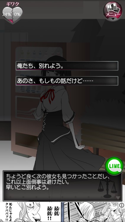 よくある恋愛アプリは自分とアプリ内の異性の人との楽しい恋愛ストーリを辿るアプリが多い中、少し変わった恋愛アプリがやりたいなと思ったことはありませんか?「元カノ(仮)と今カノと僕」はそんなありきたりなキュンキュンできる恋愛アプリとは違ってスリル満点!サスペンスと脱出、新感覚ノベルが一気に楽しめるアプリです。日常的なアプリに飽きてしまった人にもとても良い刺激になるアプリとなっています。
