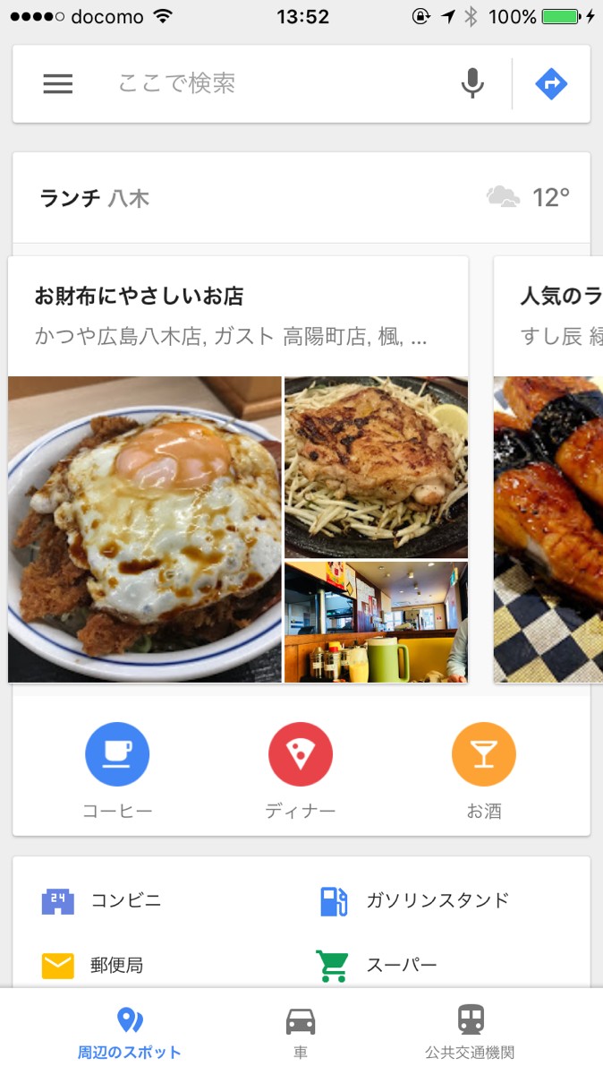 「周辺のスポット」ボタンでは、人気のランチスポットやディナースポット、お財布にやさしいお店などをピックアップして紹介してくれます。口コミやメニューの写真などもチェックできるのも魅力です。