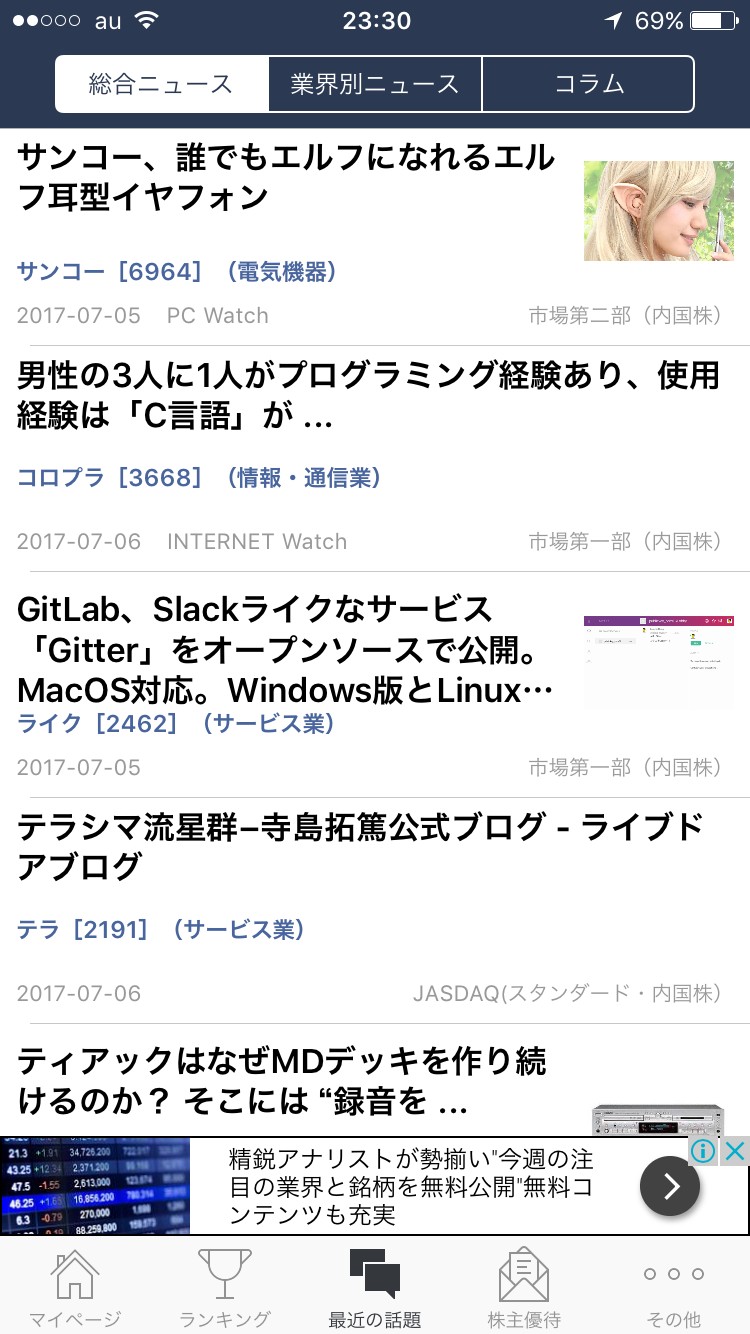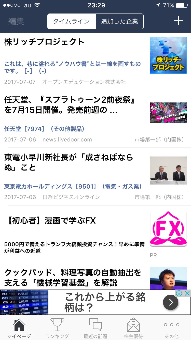 「株ニュース」の一番のポイントは、タイムラインで、企業のニュースがどんどん流れてくること。
