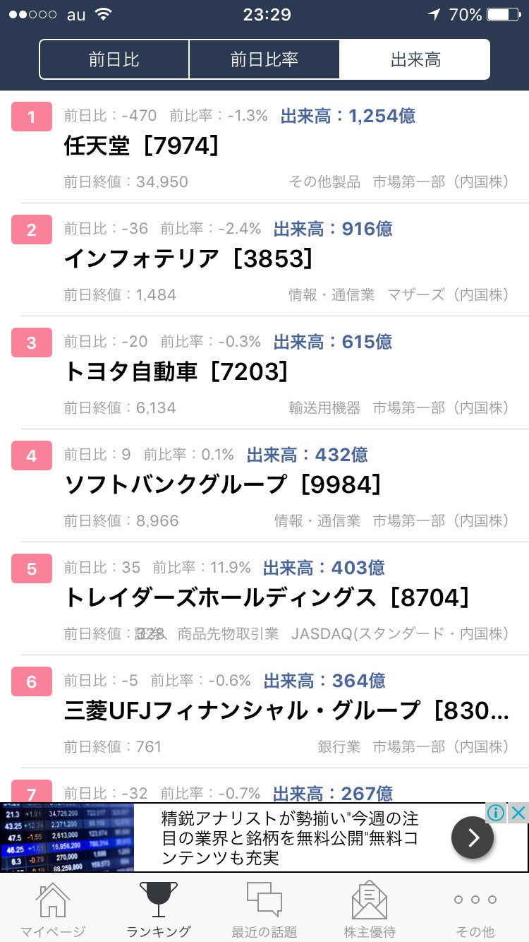 ランキングのタブを開くと、「前日比」・「前日比率」・「出来高」のランキングを見ることが出来ます。