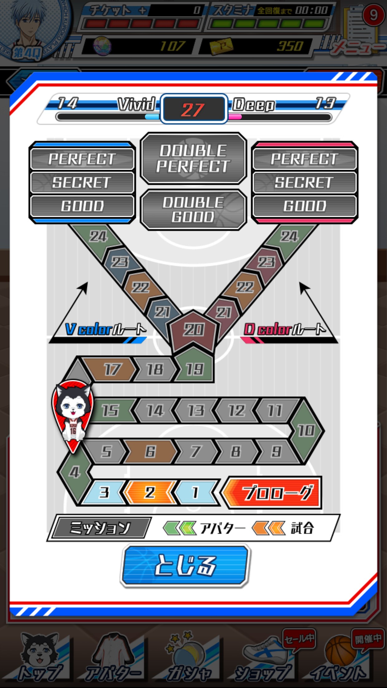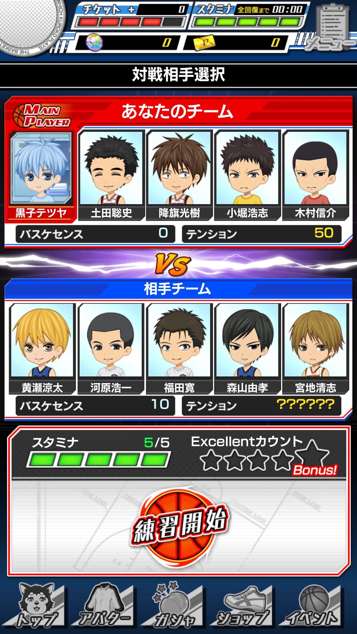 この「試合」に勝利するためには、バスケセンスが必要です。バスケセンスは日々の「練習」で磨くことができます。試合に勝利するには日々の努力が必要ということですね。バスケゲームらしいです!練習でバスケセンスを磨いて、黒子たちを勝利へと導きましょう!