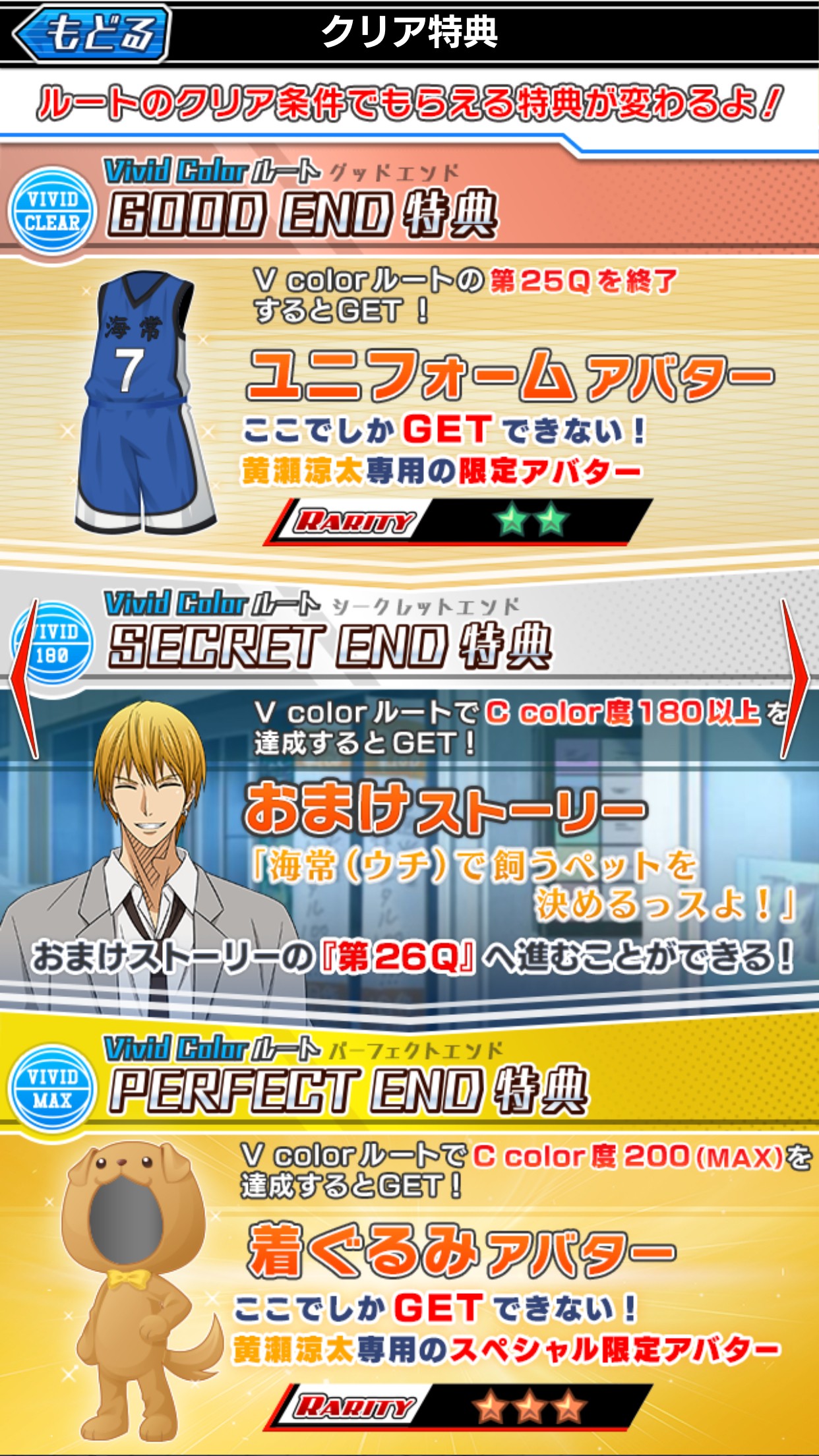 「PERFECT END」「SECRET END」「GOOD END」の3つの結末に辿り着くと、クリア特典としてそれぞれ違った特典が用意されいます。「GOOD END」では視点キャラクターのユニフォームアバター、「SECRET END」ではおまけストーリー、そして「PERFECT END」ではここでしかGETできないスペシャルアバターが獲得できます。つまりは、「C color」が高ければ高いほど、スペシャルな特典をGETすることが出来るんです!ここでしか手に入れることが出来ないスペシャルアバター…ぜひGETしてアバターに着せ替えさせて楽しんでみたいですし、ストーリーの続きのおまけストーリーも気になります!ストーリーが2つに分かれる上に、選択肢によって獲得できる特典まで変わってくるなんて、やりがいがあって燃えますね!特典のためにもう1度ストーリーを読んだり、たどり着いてないもう1つのルートを読んだり、と何度もストーリーを楽しむことができて飽きずにプレイ出来ますね。