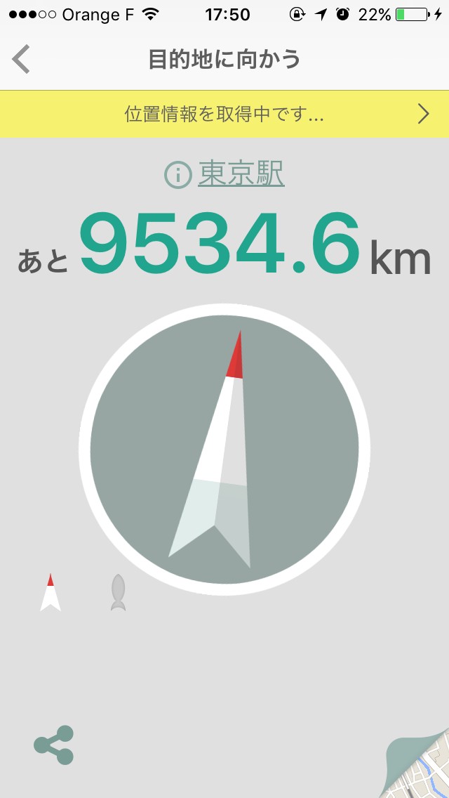 地図をくるくると回して、自分の向かっている方向がわからなくなってしまう人や、「地図は全く読めません」という人にオススメなのが、このアプリです。目的地を入力して位置情報をオンにすると、地図の表示ではなくコンパスが表示されるので、コンパスの指す方向に向かっていけば目的地に到着することができます。