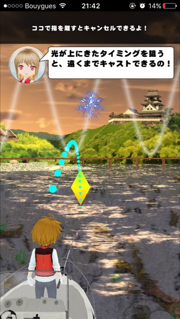 釣りを開始すると、キャスティングから始まります。画面をドラッグすると、ルアーの落下地点のカーソルと、投げるタイミングの波が表示され、光が波の一番上に来た時に指を話すと遠くに投げることができます。遠くに投げると、大きい魚がヒットしやすくなります。
