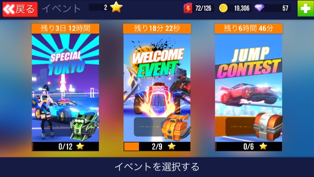 通常のレース『ワールドカップ』はエネルギーを消費して参加しますが、『イベント』にはコインを消費して参加することができます。チャレンジを達成すると、『チェスト』が報酬としてもらえます。