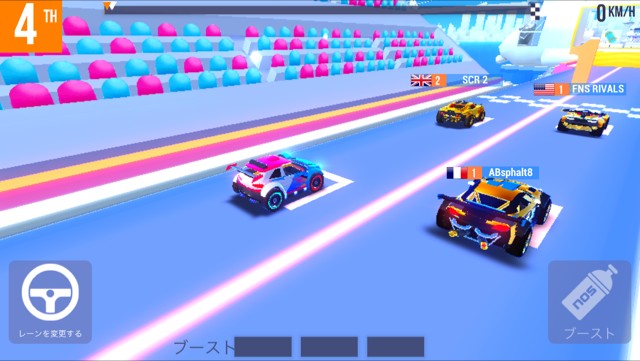 スマートフォンを横向きにして遊ぶゲームですが、レース中の操作方法は左下にある『レーンを変更する』と右下にある『ブースト』をタップする操作だけです。