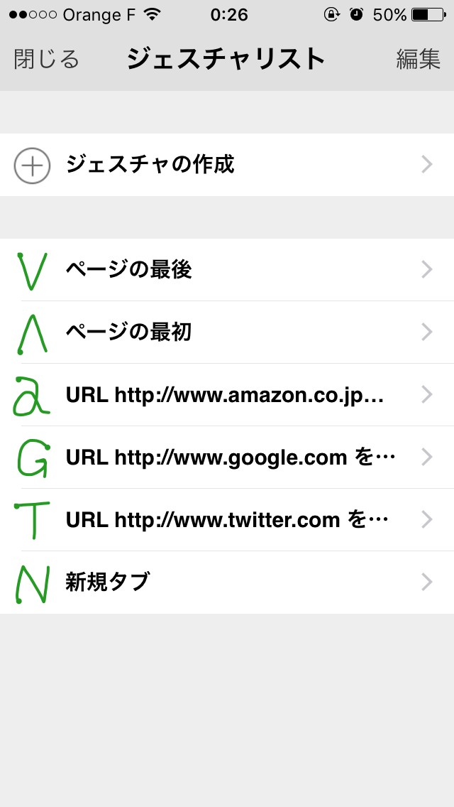 『ジェスチャ』を使えば、文字入力をする必要なく、指で記号を書くだけで目的のサイトを開くことができます。お気に入りのサイトと記号はそれぞれ自分で設定が可能です。