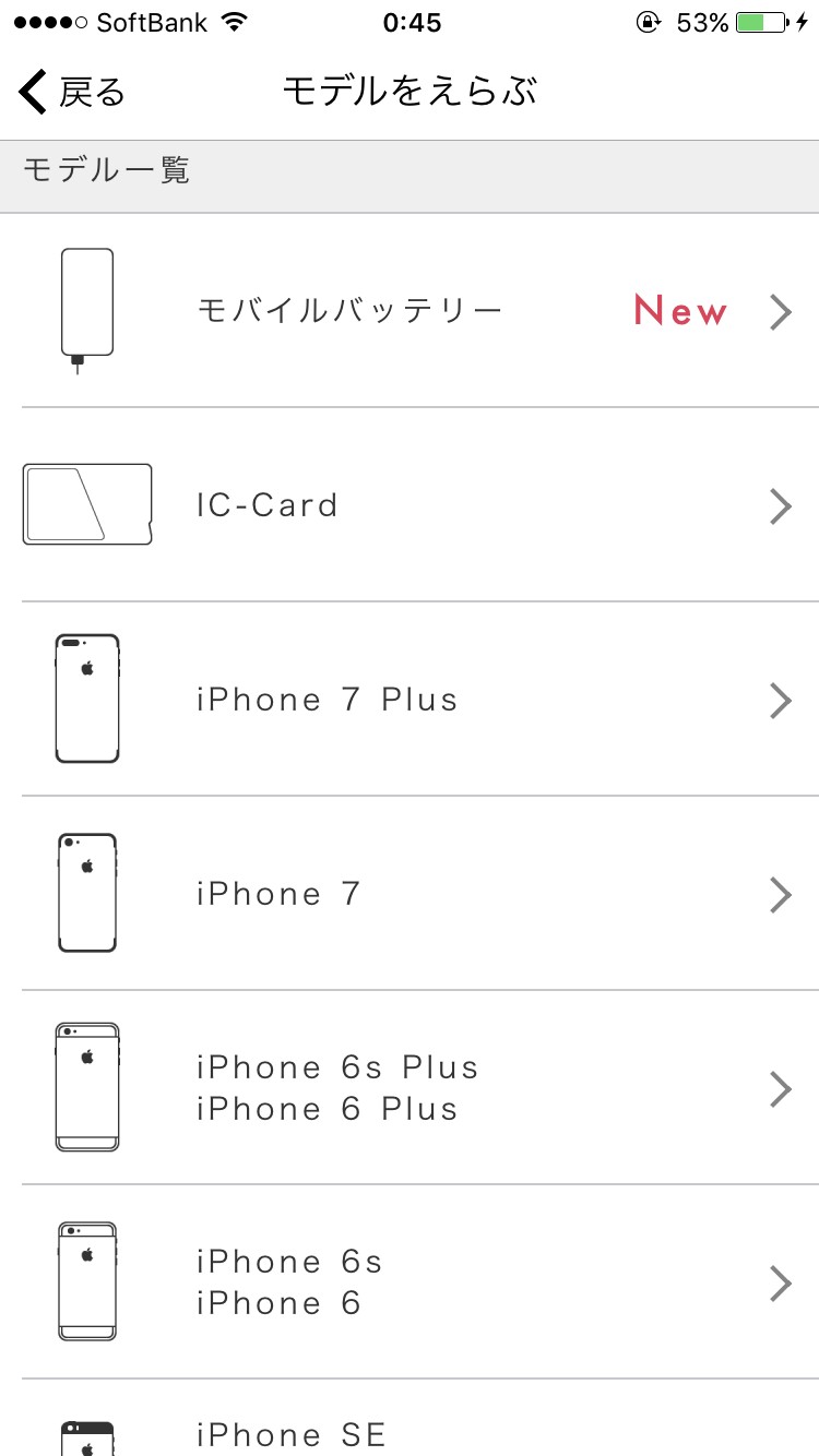 iphone版では、モバイルバッテリー、IC-Card、iPhone7Plus、iPhone7、iPhone6sPlus、iPhone6Plus、iPhone6s、iPhone6、iPhone5c、iPodtouch6th、iPodtouch5thの11種類から選択できます。