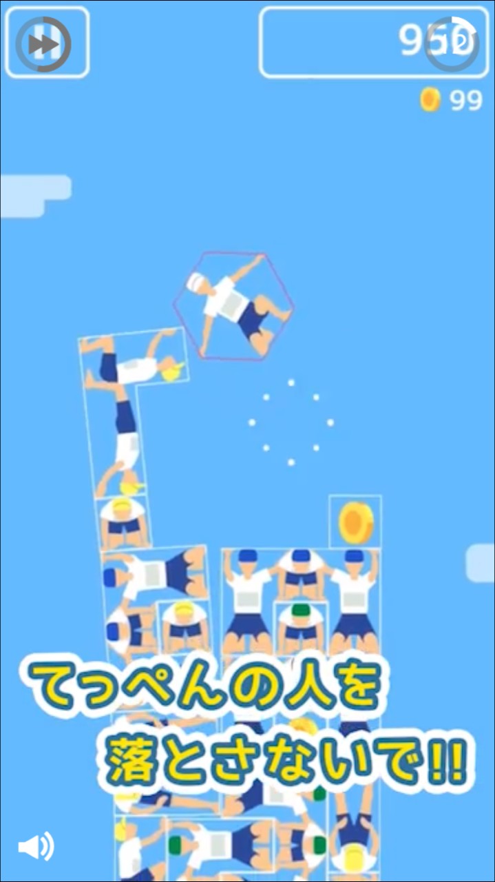組体操タワー崩しは、組体操の定番ともいえるピラミッド型の体技種目をゲーム化したアプリです。運動会でよく見る光景さながらに赤白帽をかぶり、体操服を着たキャラクターたちがピラミッド型に積み上がり、長方形のタワーを作っています。一番上にのっている白帽子のキャラクターを落とさないように、ブロックを崩していくのがルールです。崩していく途中に白帽子のキャラクターが上から落ちて転倒したらゲームオーバー。組体操タワー崩しの主要キーワードをいくつか紹介します。