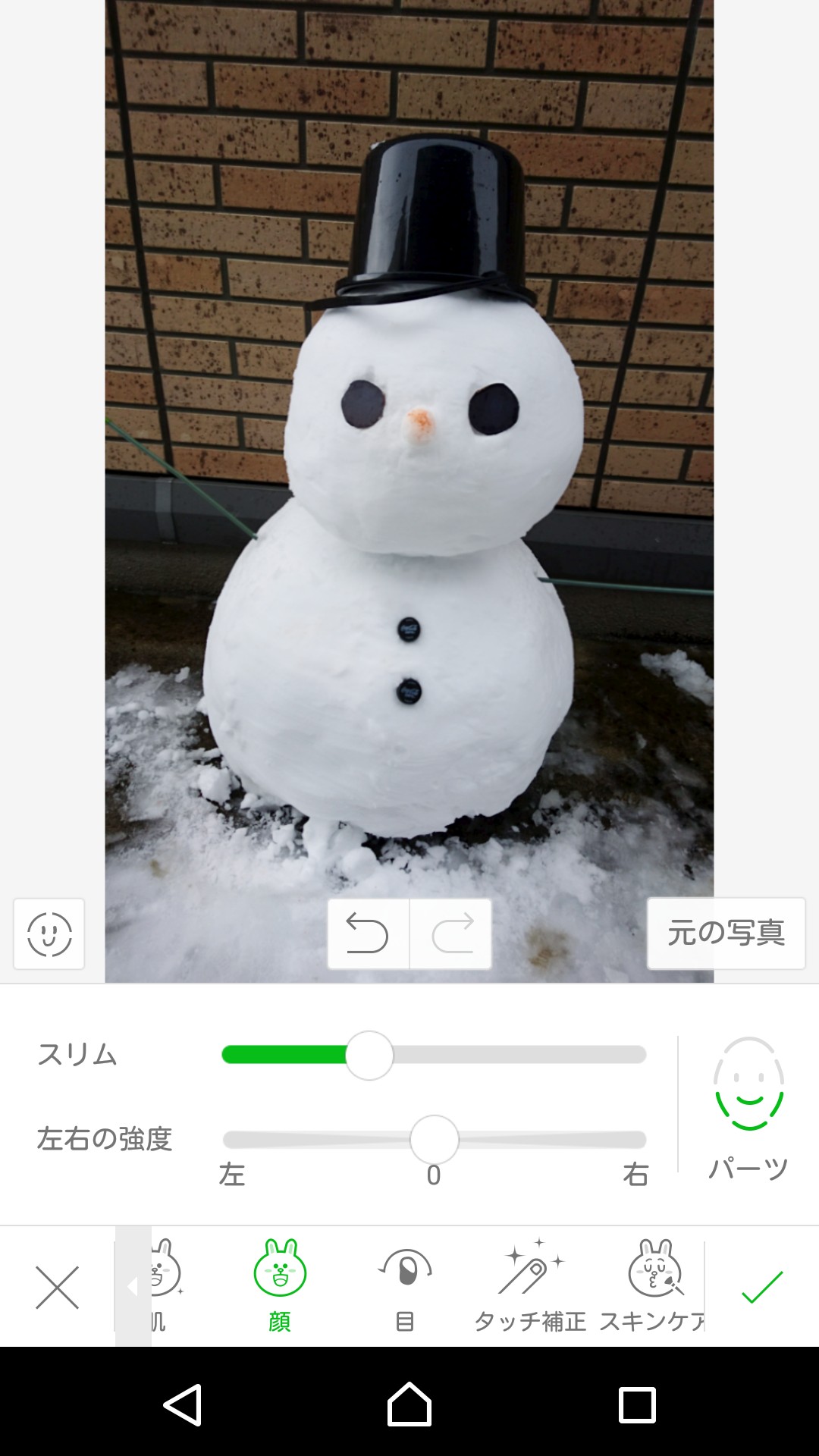 「ビューティー機能」を使って写真を加工する場合、画面左下のコニーマークを選択するとビューティー編集画面に移動します。移動後は自動で補正を行ってくれますが、自分で補正を行いたい場合は、画面中央にある戻るアイコンを選択すると元の写真に戻ります。顔認識を調整したい場合は、編集画面の中央の左側に顔マークがあるのでそれを選択すると目、口、顎を調整することが可能です。