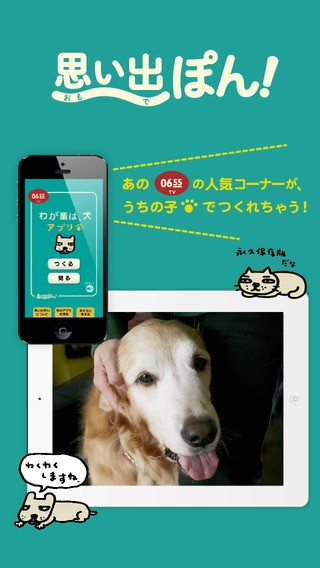 NHK Eテレ「0655」の人気犬写真コーナー「犬のうた」を再現できるアプリ、スライドショー作成アプリ「わが輩は、犬」思い出ぽん!。