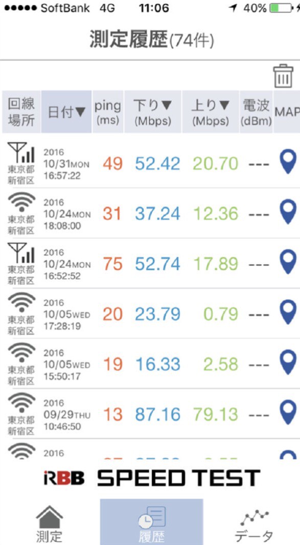 ・計測した際履歴としてデータが残り、何処が通信環境が良いのか保存しておける