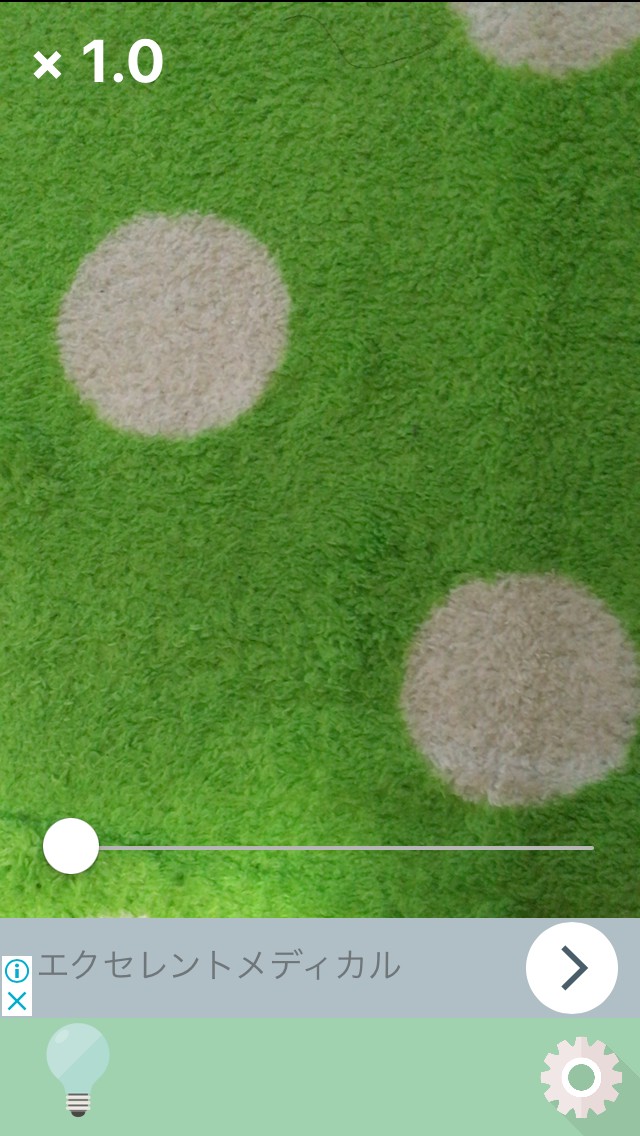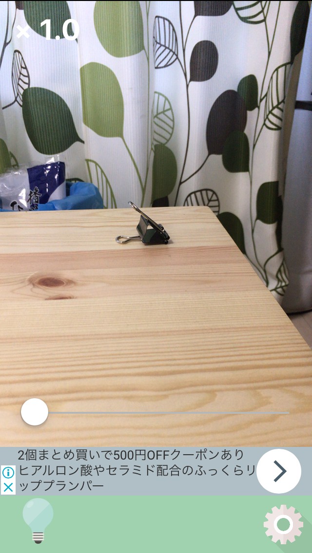 アナログの虫眼鏡にはない機能として「ライトアップ」という機能があります。単純にスマホについているライトを点灯させる電源がついているのですが、このお陰で、暗いところでも十分虫眼鏡が使えるようになります。「虫眼鏡」というアプリに加えた機能として最高のものだと思います!