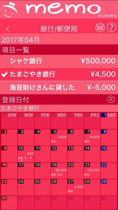 残高の登録の方法についてお話してきましたが、この「残高メモ」はカレンダーを使用して、いつ引き落としや入金があったのかを把握することも可能です。