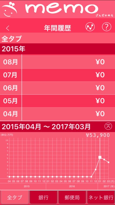 年間履歴を確認すれば、グラフを使って毎月の残高を表示してくれるので、毎月のお金の推移を長いスパンで把握できます。また年間履歴は、過去2年間のデータを保存してくれているので、過去の同じ月と残高を比較して、出費への見直しができるでしょう。