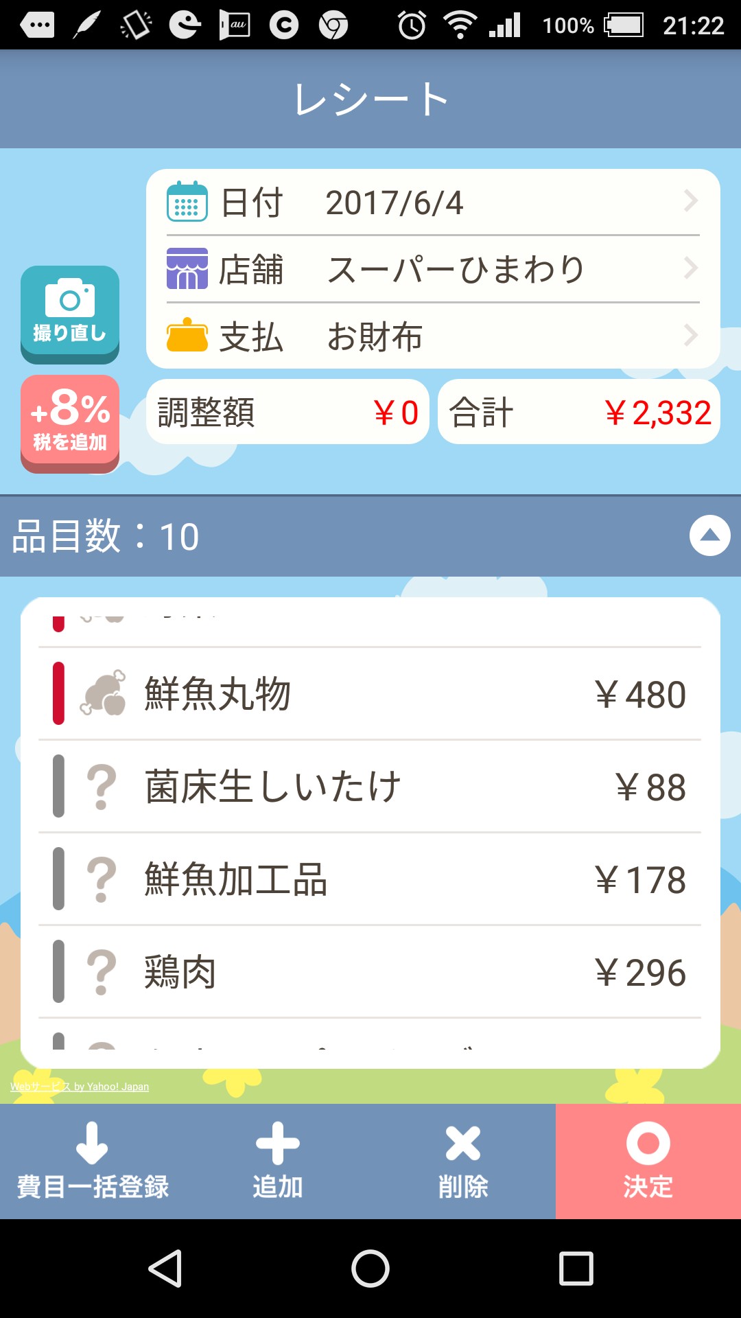 実際にレシートを撮影する際は、撮影する画面で画質の設定もできますので、読取りに不安がある場合は高画質で撮ってみましょう。レシートが長い場合は、シャッターボタンの右側にあるスイッチで画像サイズを切替えて撮影します。撮影が完了したら読取り結果が表示されます。お店の名前や合計金額、品名や価格が表示されていますので確認と修正を行いましょう。その際、品名の左がクエスチョンマークになっていたら、タップして「食費」や「生活用品」など該当する費目を選択して決定します。