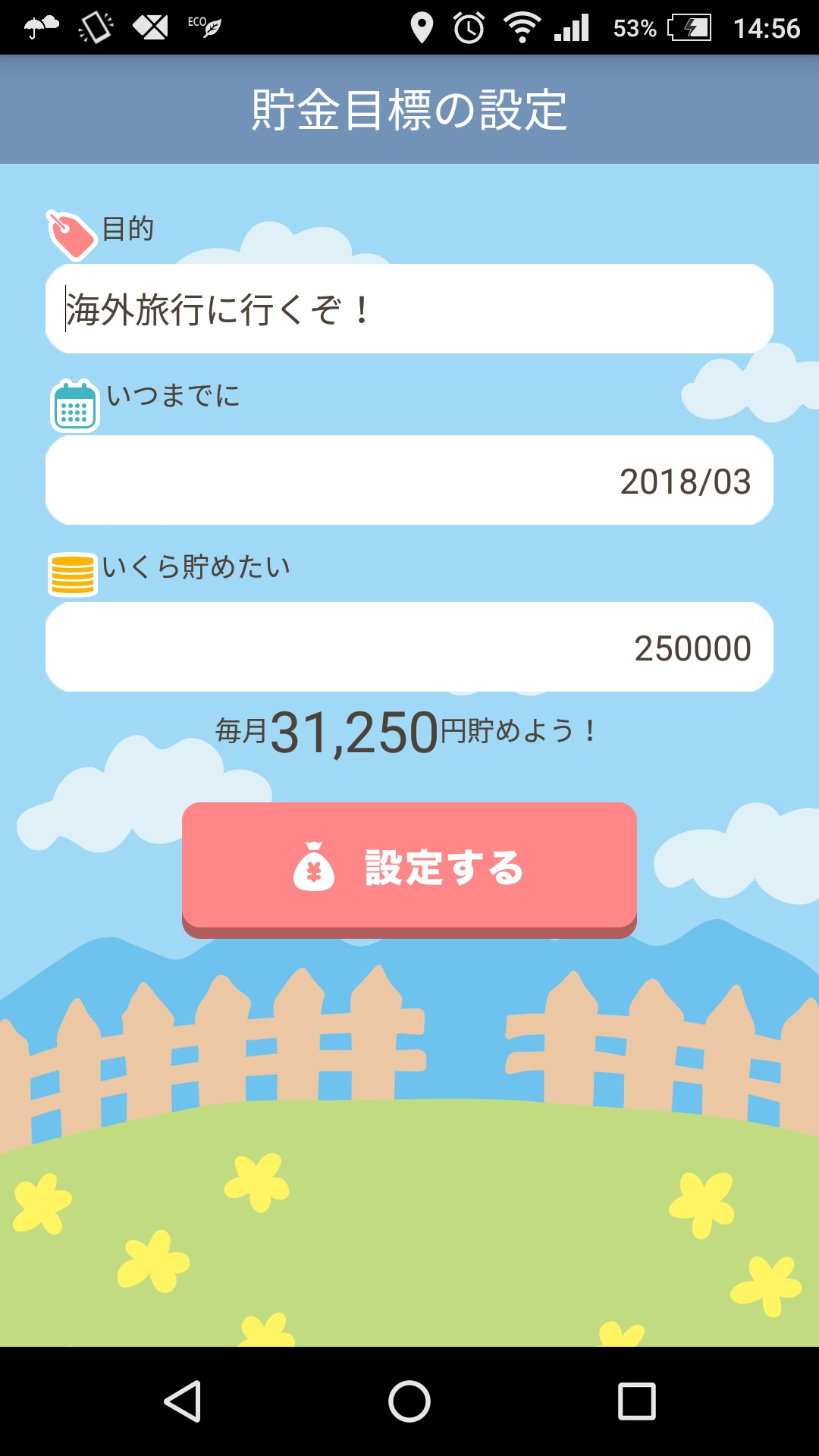 同じ「グラフ集計」の画面にある「貯金バコ」で貯金の目標設定もできます。たとえば、来年の3月までに家族で海外旅行に行くための旅費を大体の目標金額で設定すれば、そこから計算して1か月の目標貯金額が表示されます。翌月の始めに前月の浮いた金額が貯金バコに移動して加算されていく仕組みですが、どんどん目標金額に近づいていくと励みにもなります。