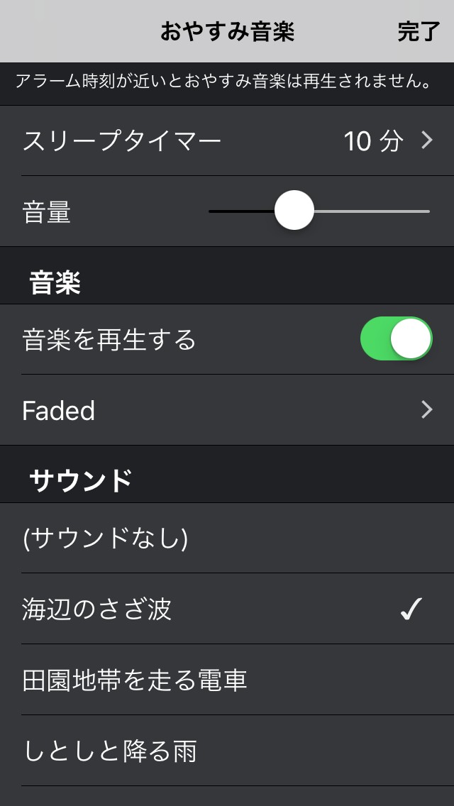 時間をセットしたら「アラームをセットする」というボタンを押せばいいのですが、「スリープタイマー」もセットできます。それは「何分かけるか」「音量はどのくらいにするか」「サウンドか音楽をかけるのか」というような細かいものを「アラーム」同様セットできます。