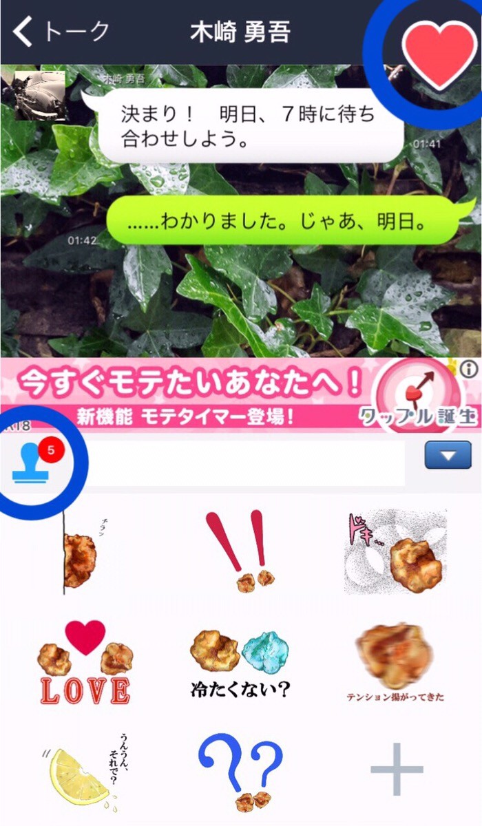 入力バーの左にあるスタンプマークを押すと唐揚げをモチーフにしたスタンプが用意されています。