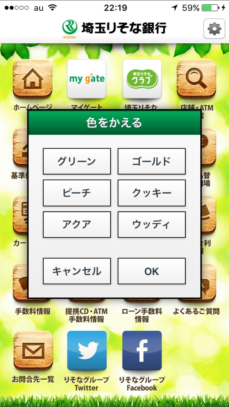 アプリ内右上の歯車マークをタップすると、アイコンの色をグリーン・ゴールド・ピーチ・クッキー・アクア・ウッディの中から選択できます。