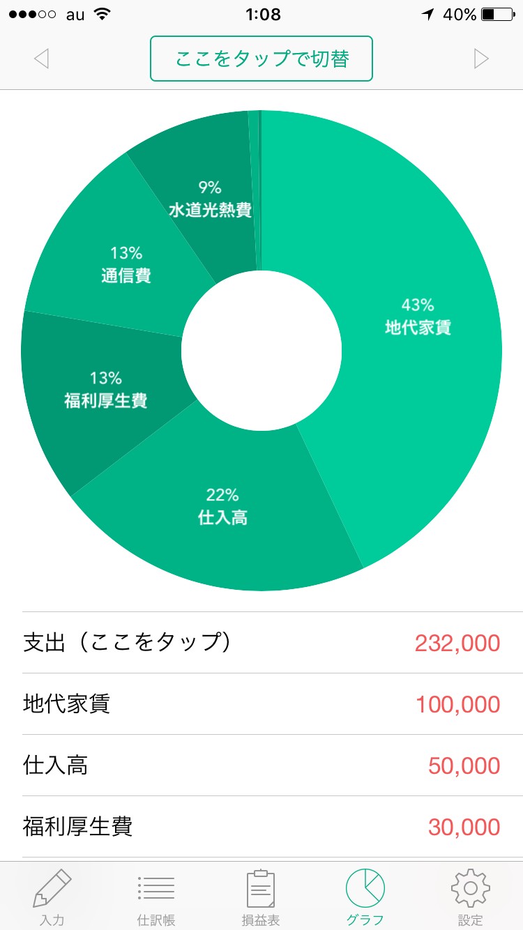 記帳した内容は記帳時に登録した金額や科目を利用して仕分けすることができ、科目別・年別・月別・日別の内訳をグラフで見ることができます。