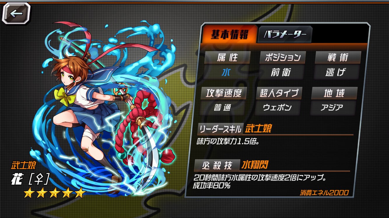 必殺技は、20秒間見方水属性の攻撃速度を2倍にするものであるため、水属性チームの場合はさらに真価が発揮されるだろう。