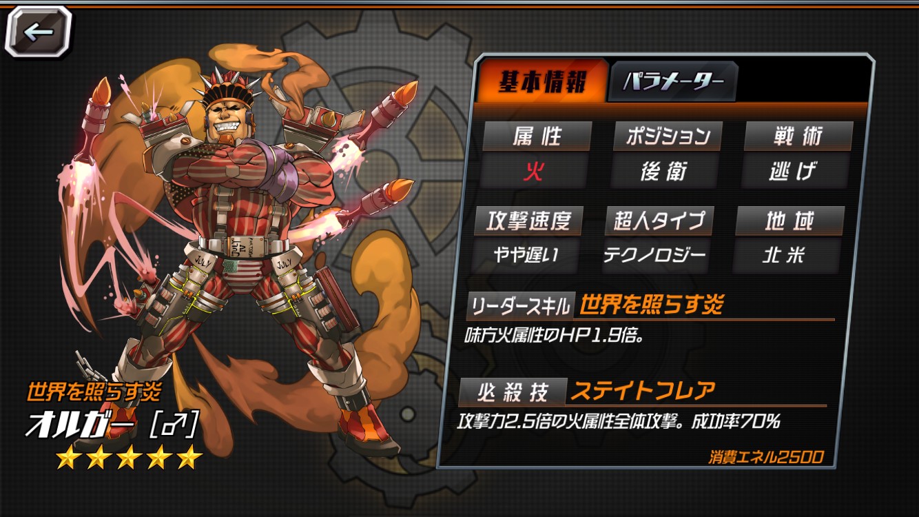 必殺技は、攻撃力2.5倍の火属性全体攻撃だ。火属性チームのリーダーだけでなく、攻撃もこなせるため火属性チームには欠かせない超人。
