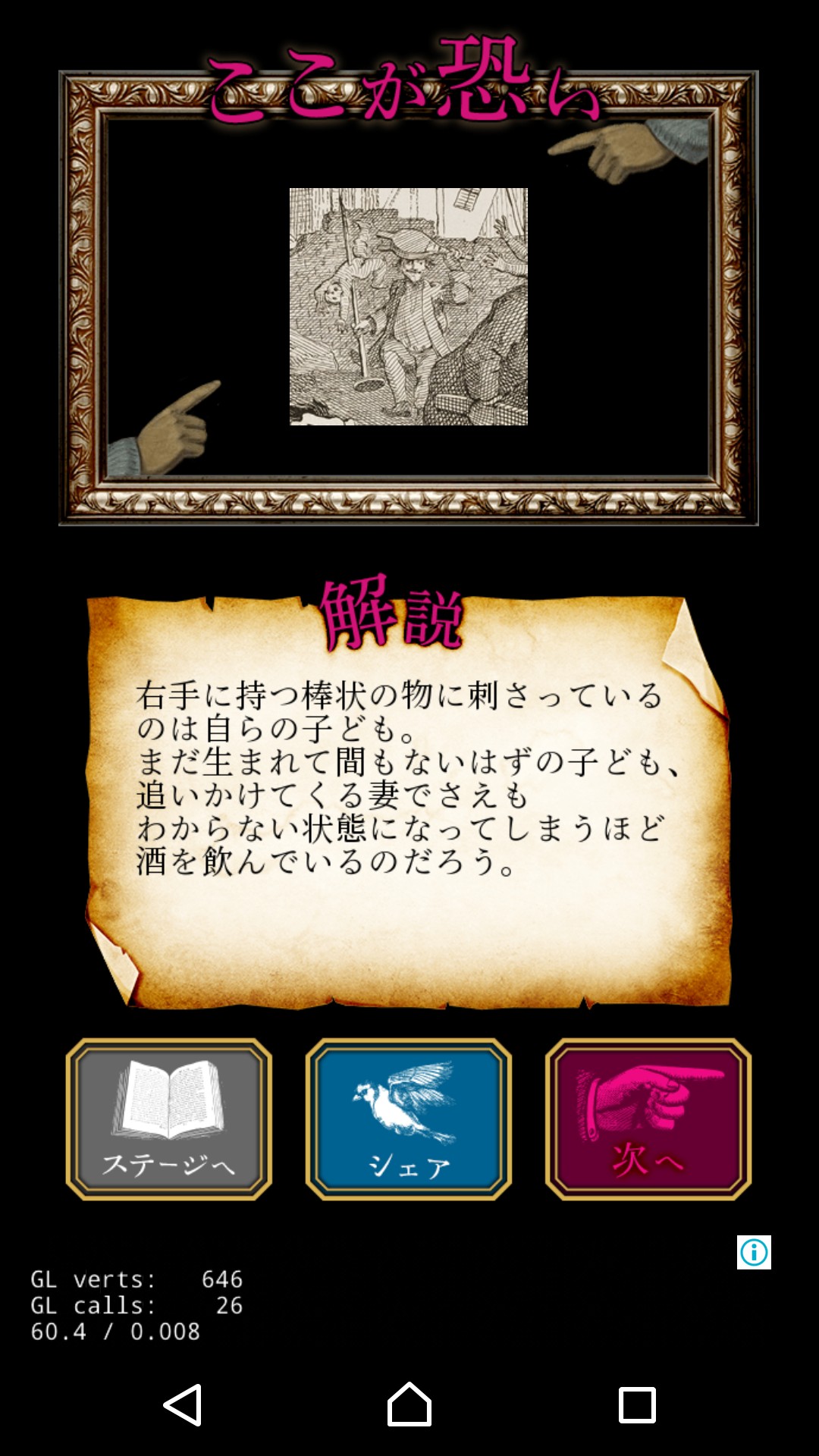 - 題材となっている絵画は全20ステージ。1ステージ1枚の絵画の中から恐い箇所を4カ所探し当てます。