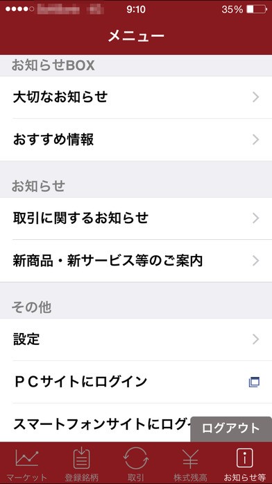 起動時に表示する画面を、<マーケット><登録銘柄><取引><残赤><お知らせ等>の5つから選ぶことができたり、ログイン時の自動更新間隔の設定、お知らせの自動更新間隔や約定通知の設定など、カスタマイズ機能も充実しているので、より快適な株取引をサポートしてくれます。