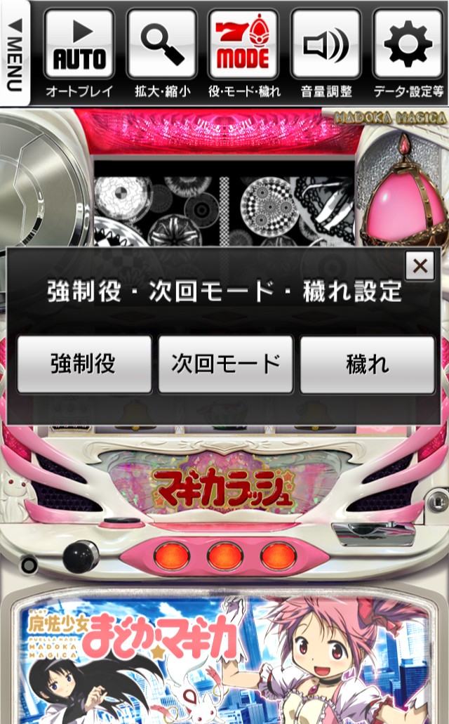 パチスロのアプリでは、強制役を使えるものが多くあります。もちろんこのアプリでも使えますが、さらに次回のモードまで選べるのが特徴です!