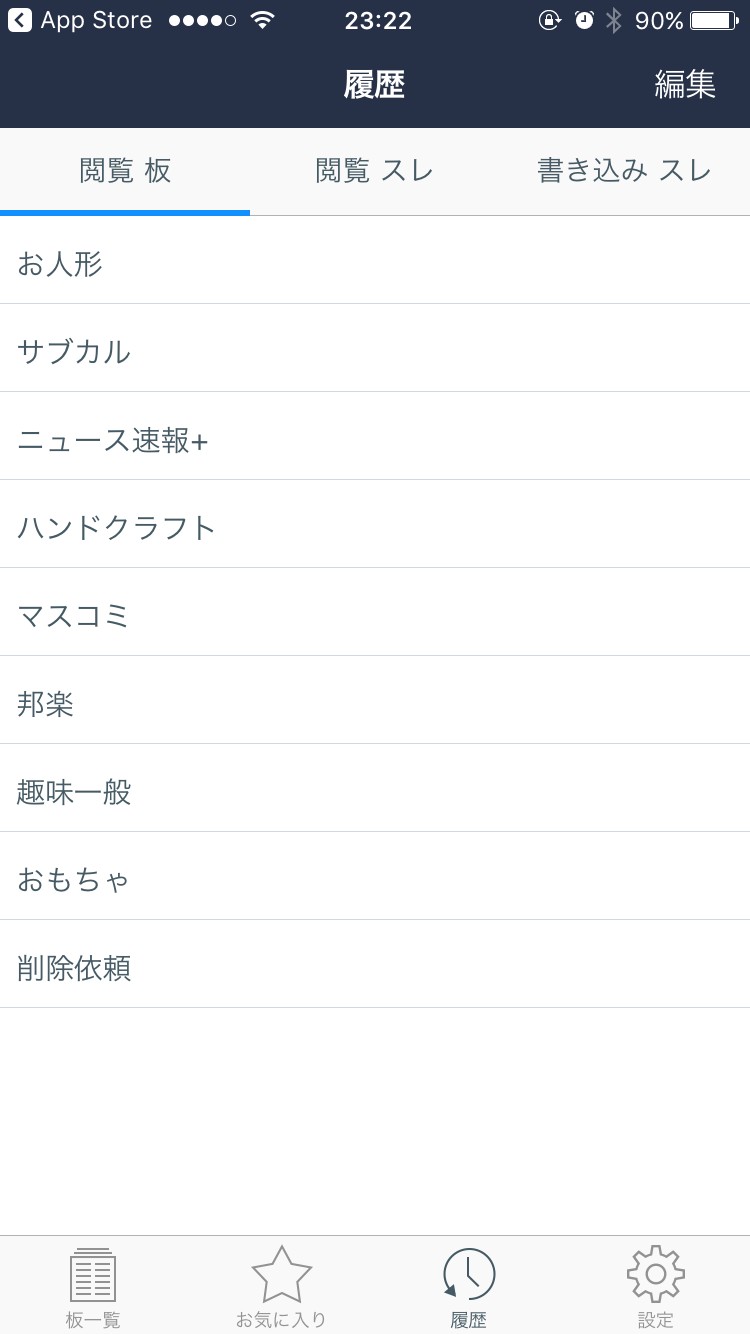 履歴はその名前の通り、このアプリで自分が見た掲示板の履歴を振り返ることができる機能です。お気に入りは、星マークを自分でチェックしなければいけませんが、見た掲示板が自動的にこちらに表示されます。