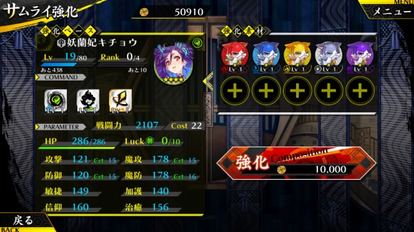 サムライのレベルを上げることで、サムライのステータスを上昇させることができる。クエストクリアでも経験値を獲得できるが、クエスト報酬やドロップなどで入手したサムライを強化素材にした方が効率的だ。