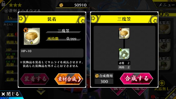 クエストで入手した素材で装飾品を作成し、サムライに装着させることで、サムライのパワーアップが可能だ。さらに、6箇所すべてに装着することで、グレードアップが可能になる。グレードアップは装飾品がサムライに吸収され、ステータスが上昇する。何度もグレードアップをすることで、強くなっていくのだ。