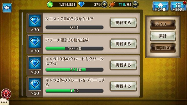 ミッションを達成することで、ダイヤがもらえるぞ。ミッションの内容はクエストを一定まで進めたり、アリーナで一定数勝利したいといったものが多い。