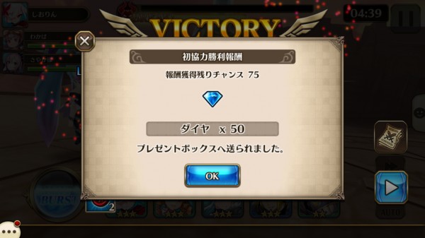 コネクトバトルの初協力報酬でダイヤがもらえるぞ。2016年7月時点、1回50個で最大100人、なんと合計5,000個ものダイヤがもらえる。