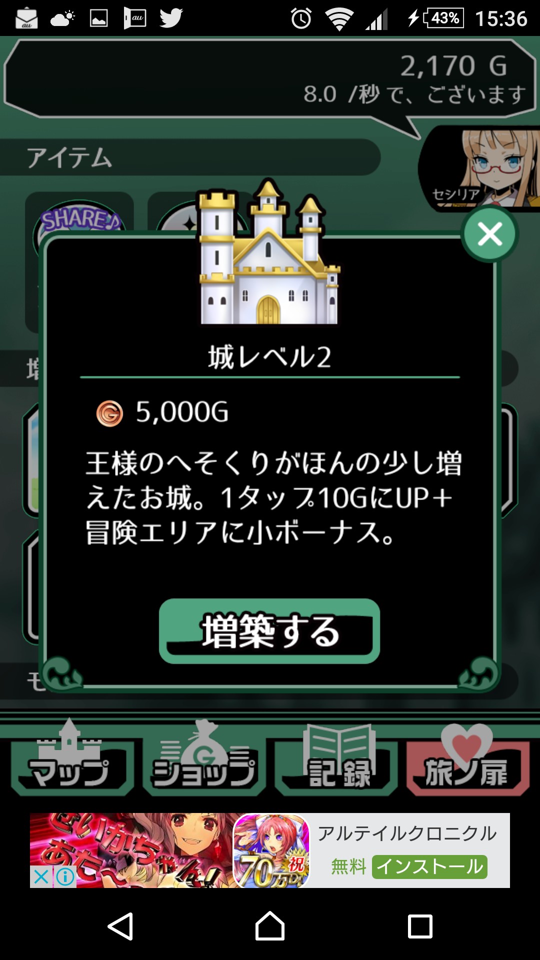 増築では城を強化することができ、ガルを消費して王様のへそくりを増やしたり1タップごとのガル取得にボーナスがついたりします。