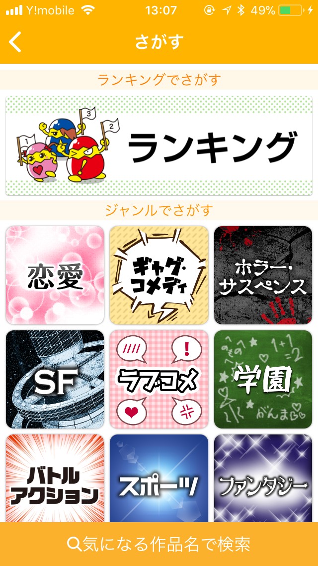画面左上にある検索マークをタップすると、「さがす」という画面になります。さがす項目には、「ランキング」「ジャンル」「更新曜日」があり、作品名で検索することも可能です。「ランキング」で検索する場合、総合ランキング、急上昇ランキング、新連載ランキングの3種類の中から選択が可能。ジャンル検索では、完結編を含めた12種類のジャンルの中から選ぶことができます。更新曜日ごとの検索では、更新曜日からその日の人気ランキングを見ることができるので、その日更新された漫画を1度にまとめ読みすることができて便利です。