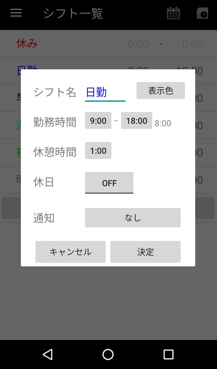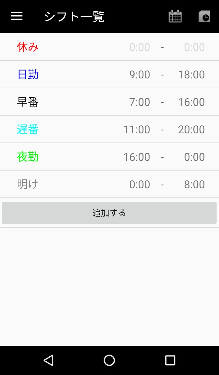 大抵のアルバイトや仕事では、「早番は○時から○時まで」「夜勤は○時から○時まで」などシフトはいくつかのブロックごとに分けられているでしょう。このアプリではシフトの呼び方やその時間帯を設定して、色づけして保存することができます。こうして設定しておくことで、アプリのカレンダー画面では一発で簡単にそのシフトを入力することができるようになります。