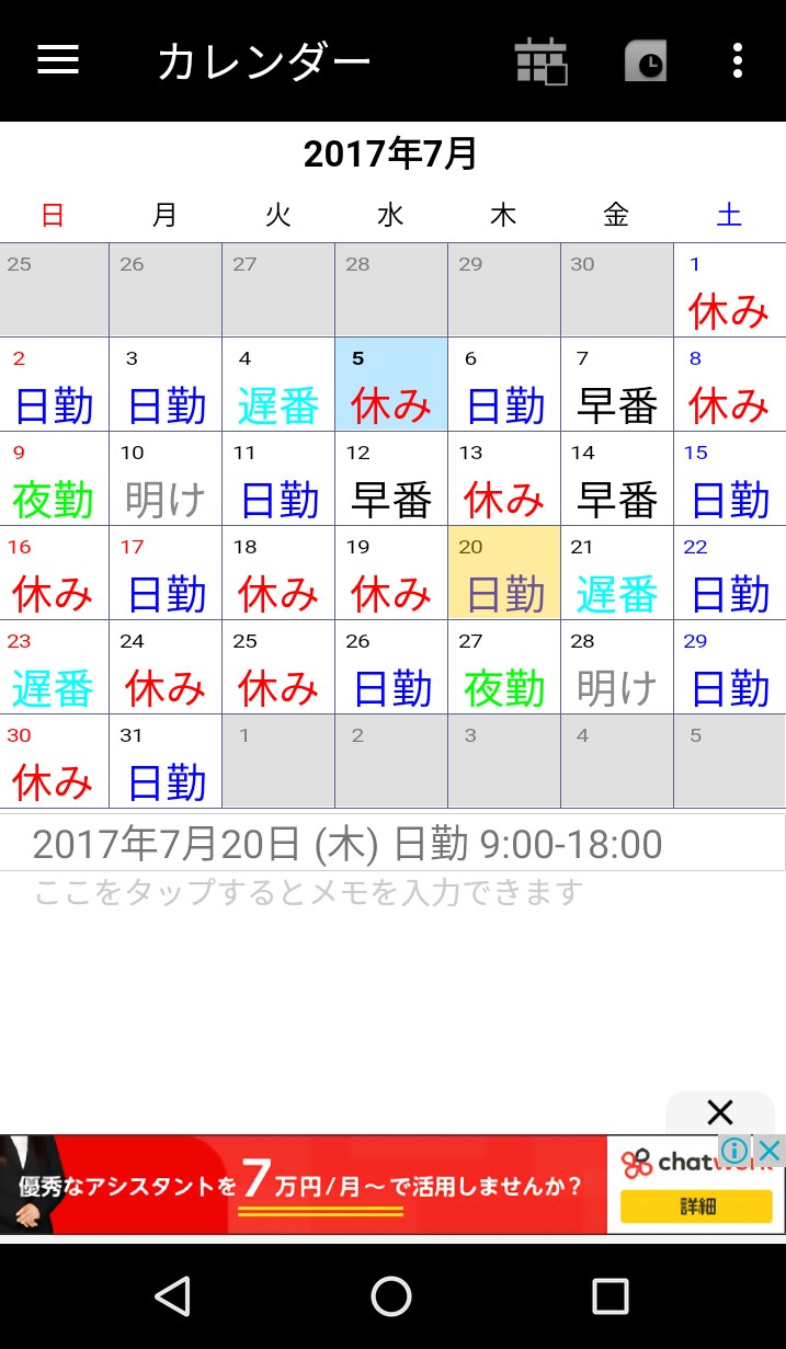 カレンダー画面ではシフトを入力するだけでなく、それぞれのシフトにメモを入力することもできます。