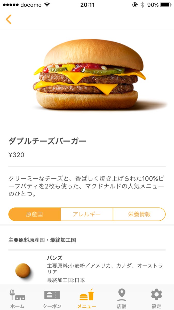 「マクドナルド」のアプリでは、マクドナルドで販売しているすべてのメニューの食材、アレルギー、栄養情報をチェックすることができます。商品情報を事前にチェックできるので、アレルギーがある人やカロリー制限をしている人などにもおすすめです。