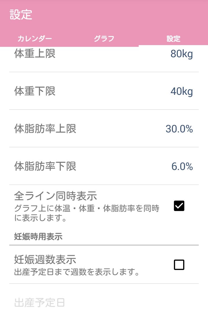 体重や体脂肪率などは特に記録しない、という方は基礎体温のみのモードに設定で変更できますので