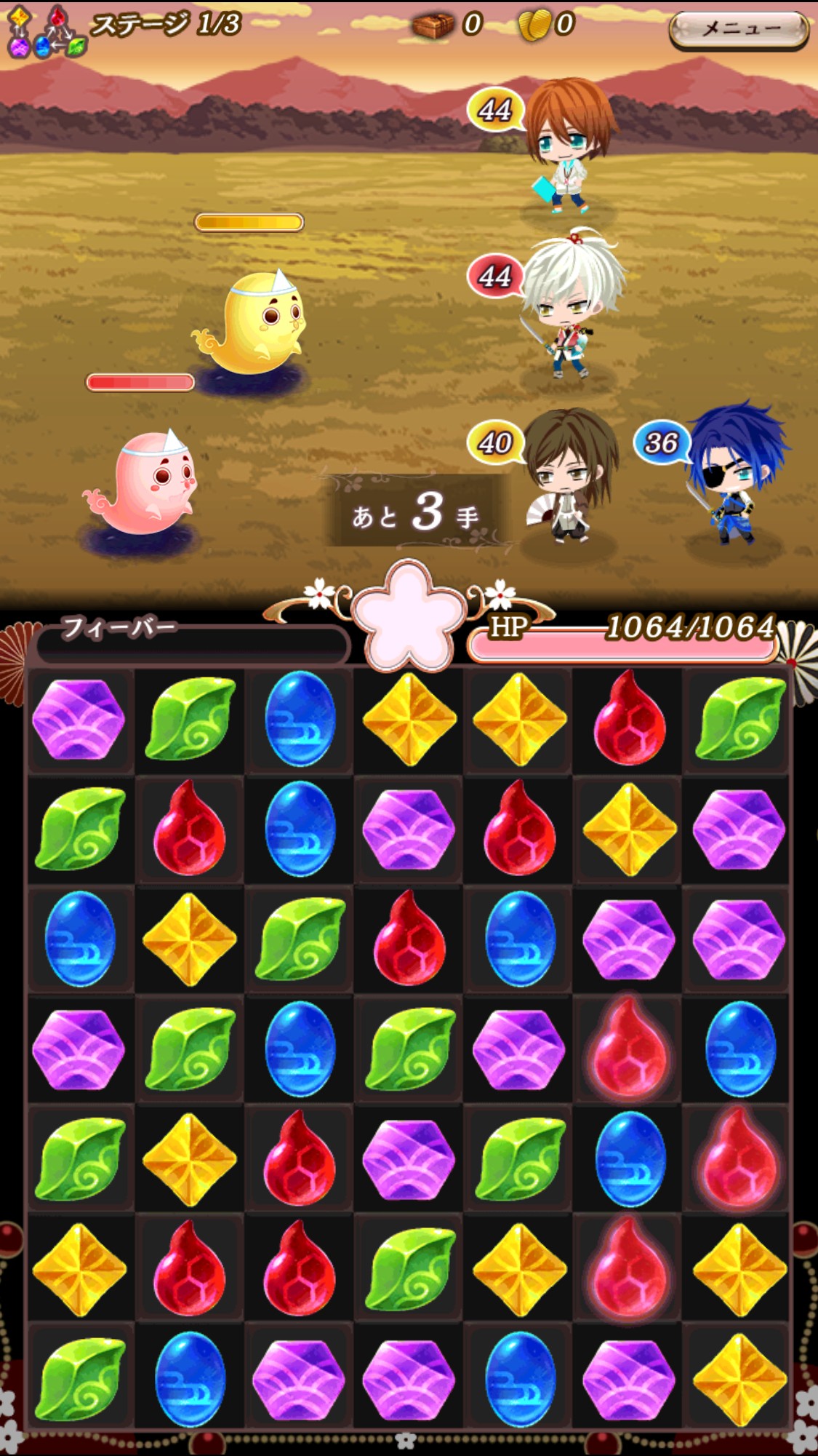 戦闘はプレイヤーがパズルをする必要があります。このパズルは、マッチスリーパズルというもので3つ以上の同じ色を縦横そろえて消していくというものです。