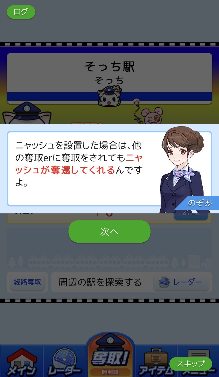 一通り使い方がわかったら、あとは近くの駅を検索して「奪取」ボタンをタップするだけで駅を自分のものにできます。もしかしたらすでに他の人によって駅を取られていることもあるので、そういうときにはアイテムを使って駅を奪ったりしながら徐々に自分の駅を増やしていきましょう。他にもアイテムを集めたり、「ニュッシュ」を着せ替えして自分のオリジナルのキャラクターを作ってみたりできます。因みに「ニュッシュ」に自分の好きな名前をつけることができるのでさらに愛着を感じるかわいいキャラクターができます。