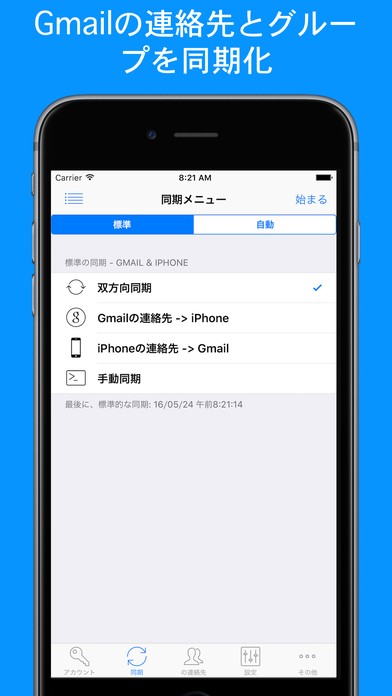 しかし一方で「iPhone→Gmailは同期したいけど、その逆は同期したくない」などといった場合もあるのではないでしょうか?そんな方にも安心、「1ウェイ同期」機能も備えてありますので、iPhone→Gmail(またはその逆)の1方向動機も可能です。